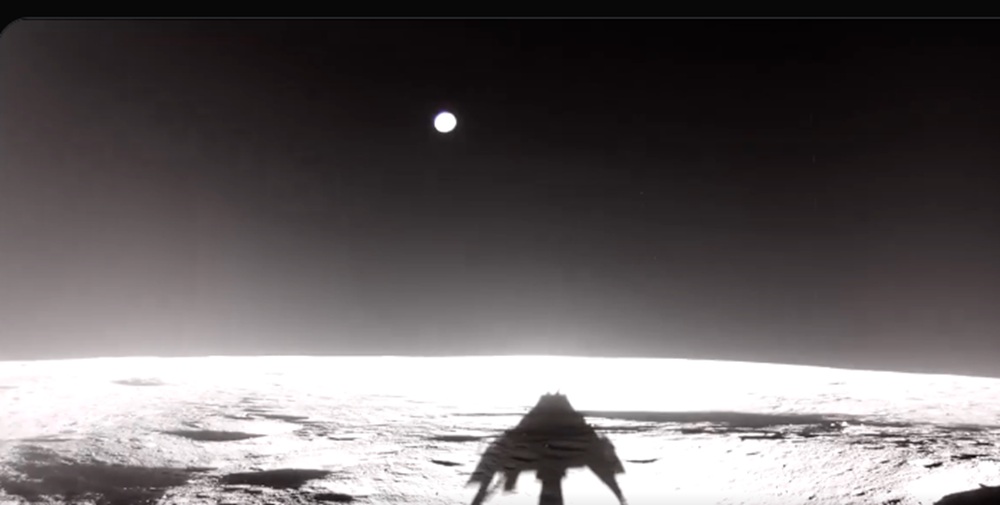 Robotul spațial a transmis deja primele fotografii de pe suprafața lunară, inclusiv o imagine în care se observă umbra navei pe solul lunar, iar în fundal apare Terra, ca o minge albastră în spațiu.