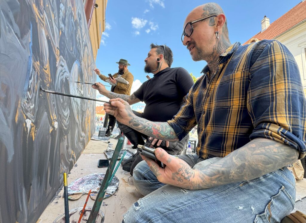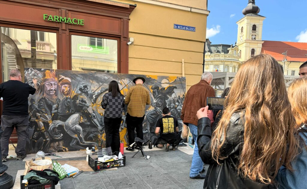 Cei cinci artişti din Sibiu şi Cluj, coordonaţi de Ovidiu Popârţan şi Marius Jucan au făcut spectacol din pictura live în ultimii doi ani, la Sibiu.