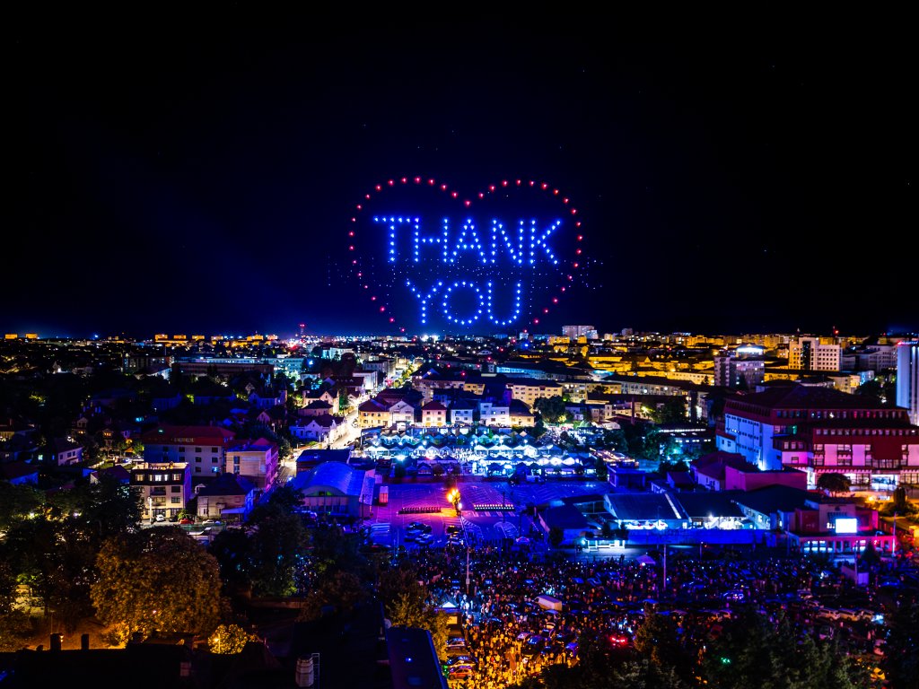 Prima zi a festivalului a ajuns la final prin show-ul nocturn de drone, încheiat de un mare și sincer Mulțumesc / Thank you, în Piața Teatrului.