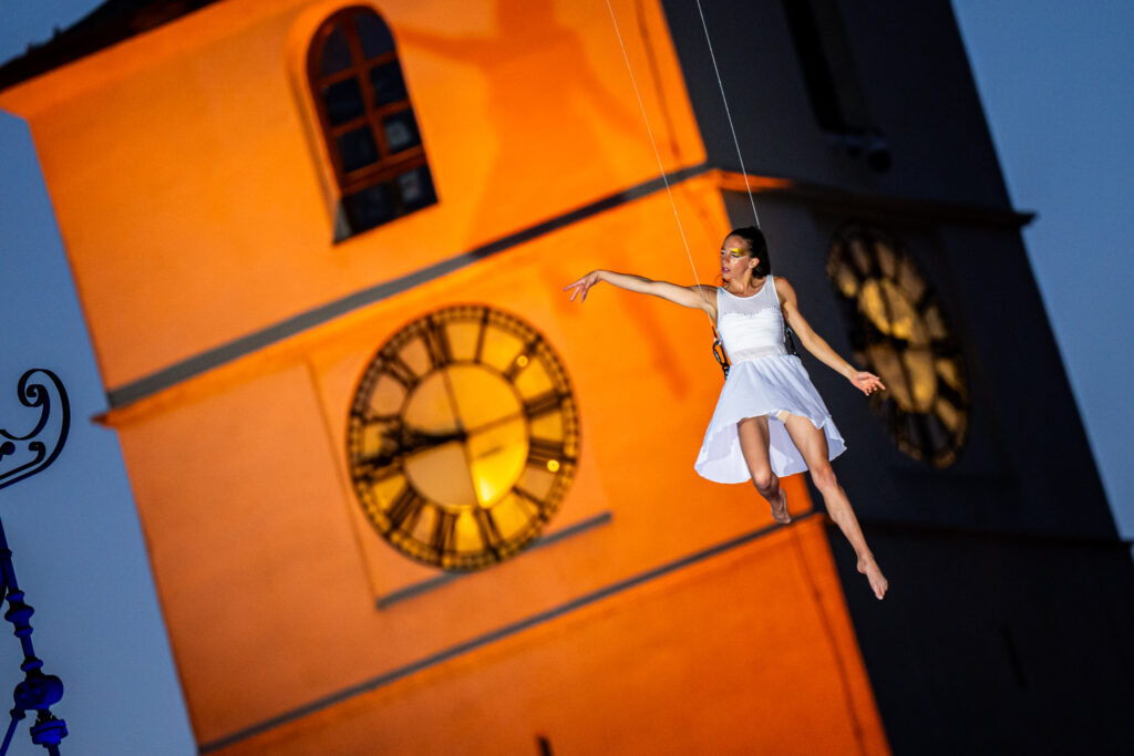 Visul lui Ymir a invitat publicul din Piața Mare într-o călătorie prin cinci stări de vis, cu acrobații la înălțime și muzică live.
