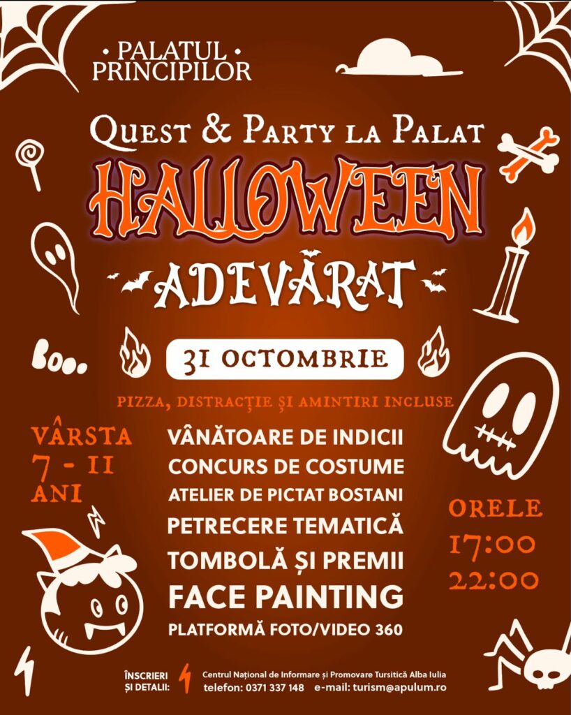 Alba Iulia se pregătește pentru o seară de neuitat dedicată celor mici. Vineri, 31 octombrie 2025, între orele 17:00 și 22:00, Palatul Principilor Transilvaniei își deschide porțile pentru o experiență inedită: „Quest & Party la Palat – Halloween adevărat!”, un eveniment tematic gândit special pentru copii.
