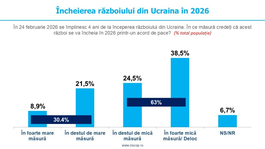 La întrebarea privind probabilitatea ca războiul din Ucraina să se încheie în 2026 printr-un acord de pace, 8,9% dintre români răspund că acest lucru se va întâmpla „în foarte mare măsură”, iar 21,5% „în destul de mare măsură”. În schimb, 24,5% cred „în destul de mică măsură”, iar 38,5% „în foarte mică măsură sau deloc”. Un procent de 6,7% nu știu sau nu răspund.
