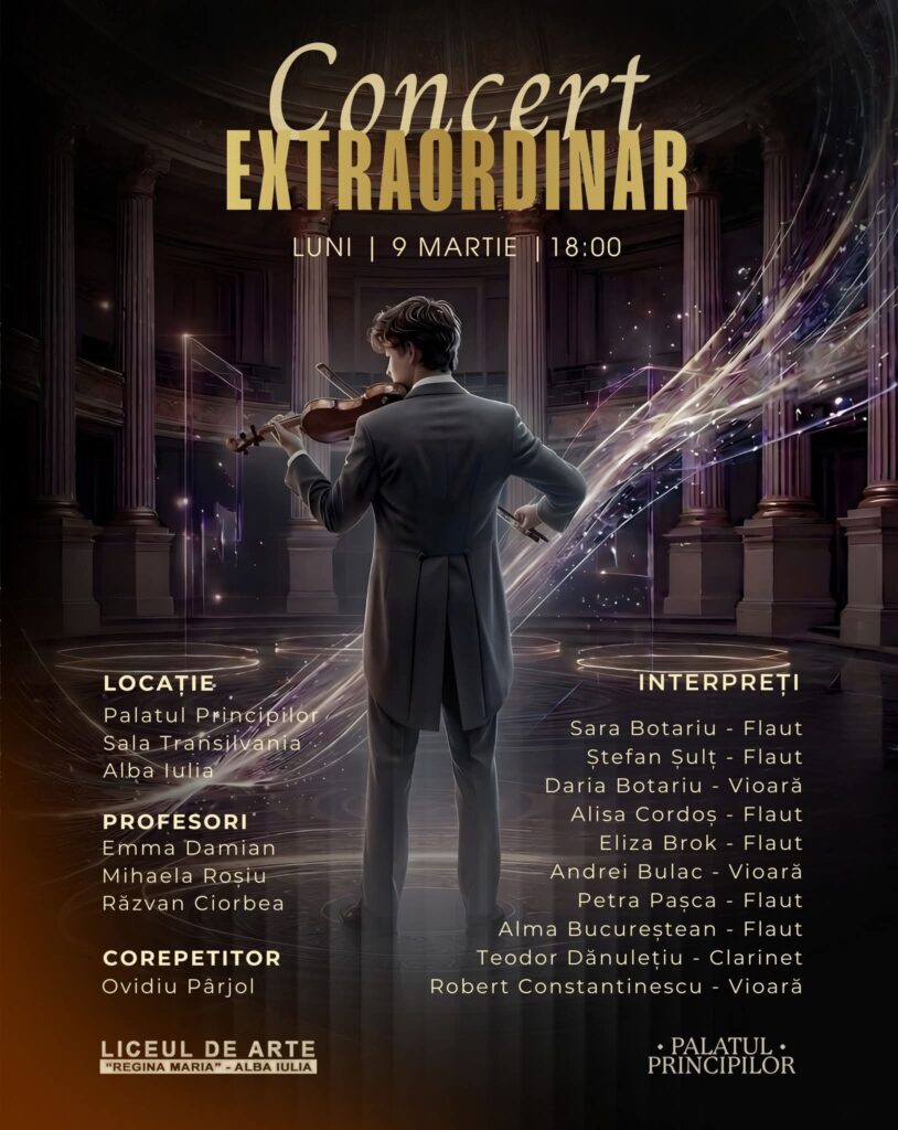 Palatul Principilor Transilvaniei va găzdui astăzi, 9 martie, începând cu ora 18, un Concert Extraordinar al elevilor de la Liceul de Arte „Regina Maria” Alba Iulia, care au excelat la olimpiadele de specialitate.