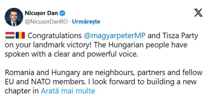 „Felicitări Peter Magyar și Tisza pentru victoria voastră istorică! Poporul maghiar a vorbit cu o voce clară și puternică. România și Ungaria sunt vecini, parteneri și membri ai UE și NATO.