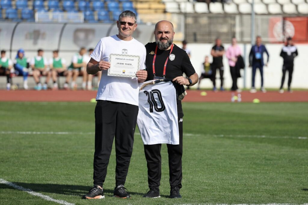 Partida a început cu un moment special pentru suporterii „alb-negrilor”. Fostul mare jucător Ovidiu Maier a dat lovitura simbolică de start și a fost premiat de club cu un tricou și o diplomă de excelență, în semn de recunoaștere pentru contribuția sa la unul dintre cele mai importante momente din istoria echipei.