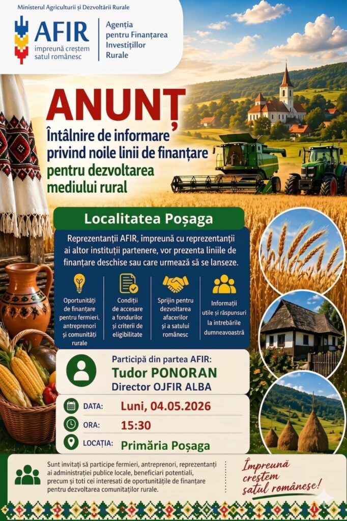 Oportunități importante de finanțare pentru fermierii și antreprenorii din comuna Poșaga vor fi prezentate în cadrul unei întâlniri oficiale organizate de Agenția pentru Finanțarea Investițiilor Rurale (AFIR). Evenimentul are ca scop clarificarea modalităților prin care localnicii pot accesa fonduri nerambursabile pentru dezvoltarea afacerilor rurale.