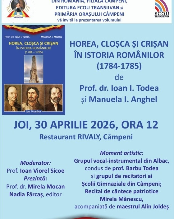 Orașul Câmpeni va fi gazda unui eveniment cultural de importanță istorică pentru zona Munților Apuseni. Joi, 30 aprilie 2026, va avea loc prezentarea volumului „Horea, Cloșca și Crișan în istoria românilor (1784 – 1785)”, o lucrare semnată de prof. dr. Ioan I. Todea și Manuela I. Anghel.